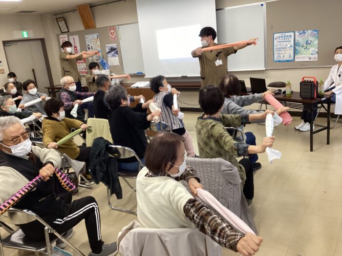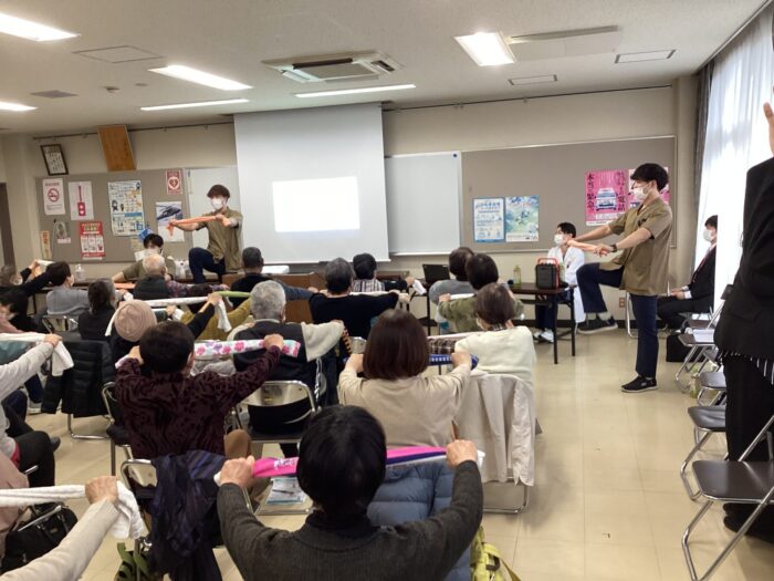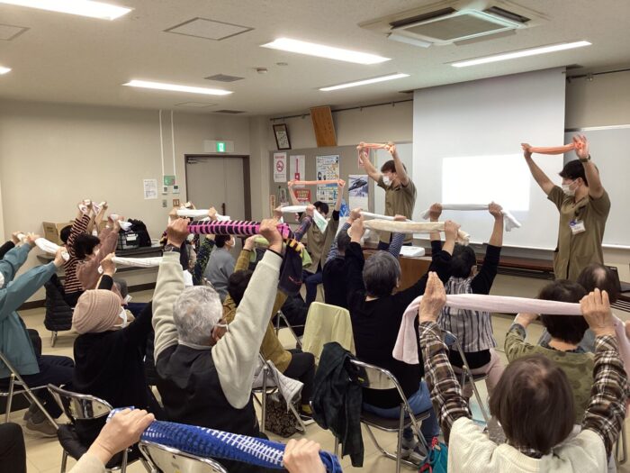 先生の「へー!!!」なお話の次は、リハビリ職員による簡単なタオルを使った体操です!