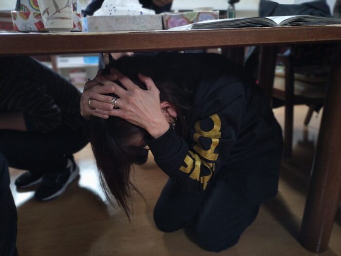 まずは自分自身の身の安全を考え机の下などに入ります!