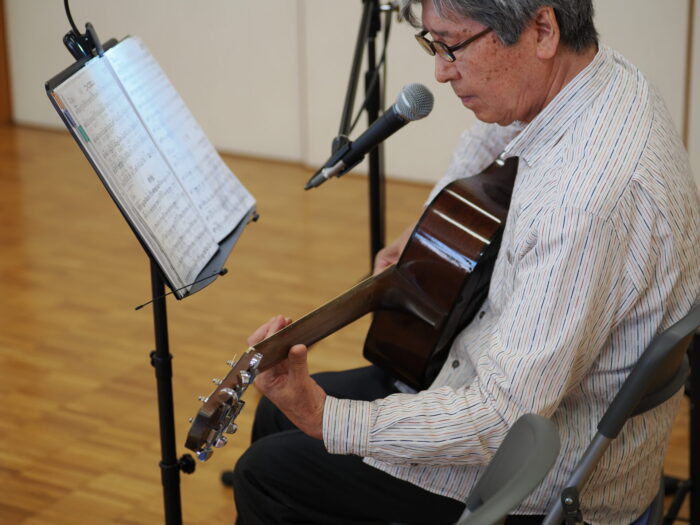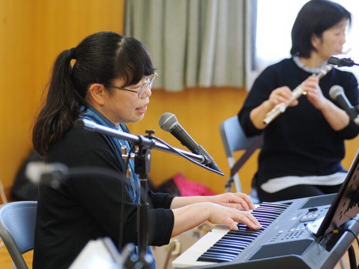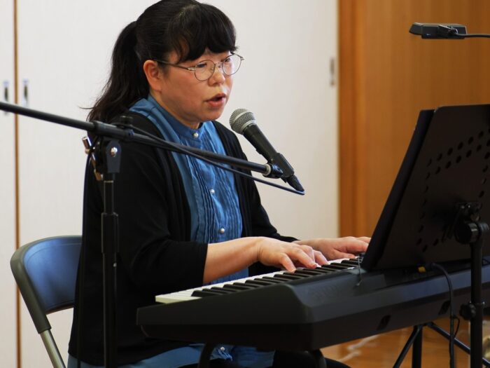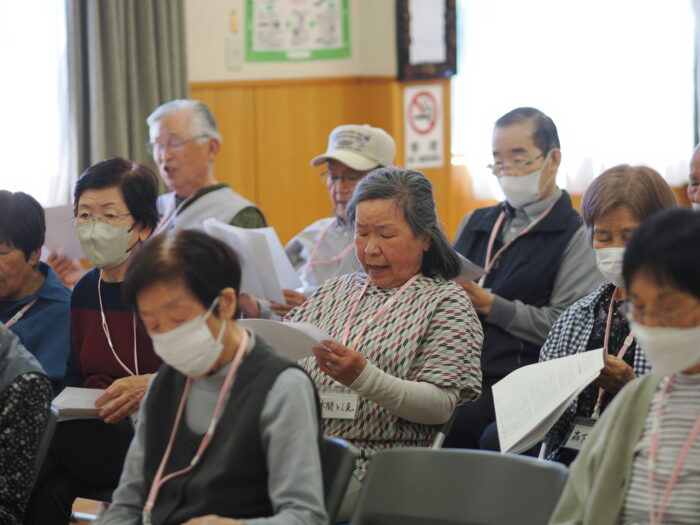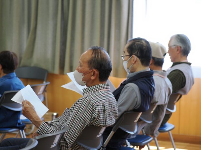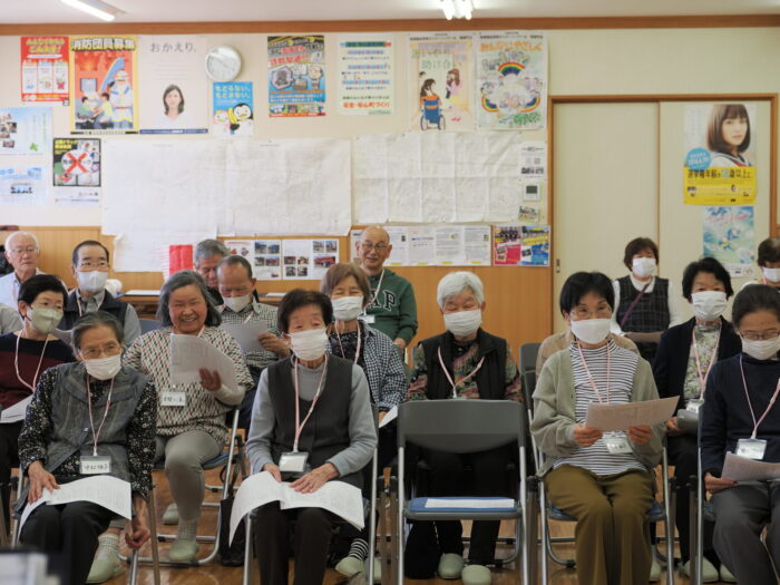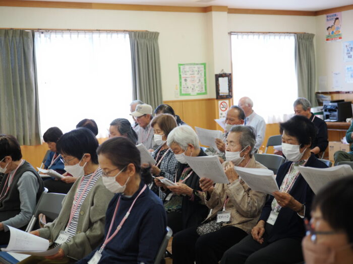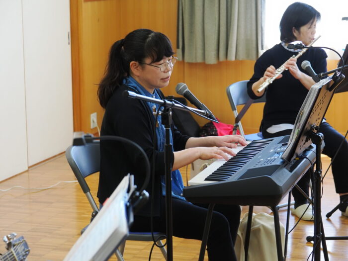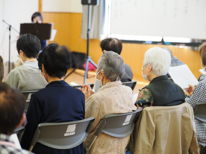 「ふれあいサロン小沢渡」は18年前に設立され、小沢渡町の六所神社にある小沢渡会館で活動しているサロンです。50名程度の皆さんが活動されており、今日は30名の皆さんが演奏を聴きにくてくださいました!歌が好きな方が多いサロンとのことです。